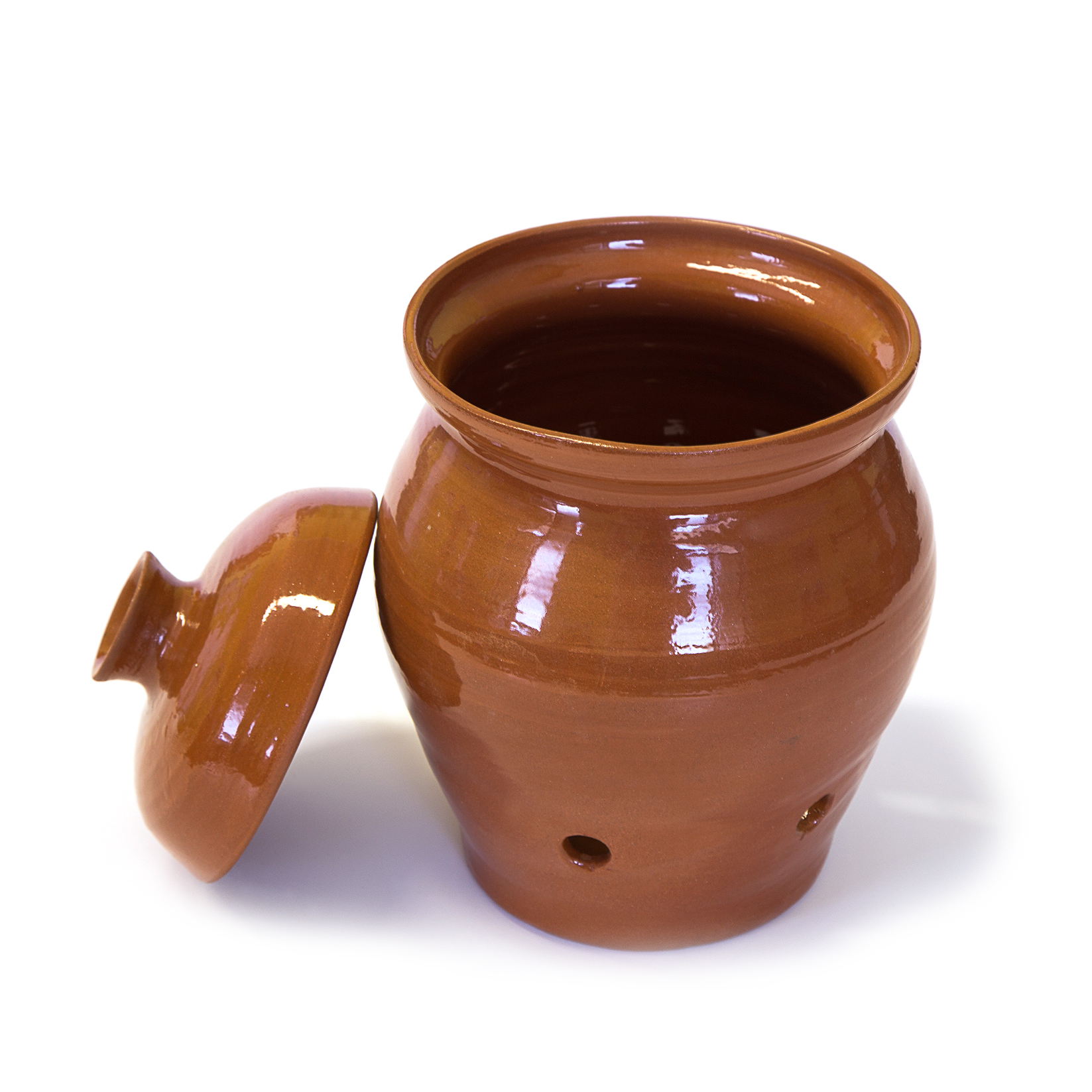 Lonec za čebulo je izdelan iz rdeče gline in glaziran.